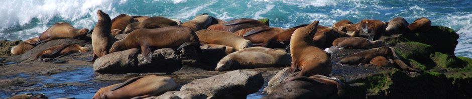 After a long walk on the beach we still had time for one more adventure. We headed south in hopes of seeing the La Jolla Sea Lions. We arrived around 2pm and we were able to snag some great free parking right at La Jolla Cove. We knew that dogs were not allowed on the beach between 9am and 4pm during the winter but were hoping we could at least get a glimpse of the sea lions. We knew we were in the right area before we got out of the car because the area is permeated with the scent of rotting fish. We were able to spot lots of sea lions as soon as we stepped up on the sidewalk.